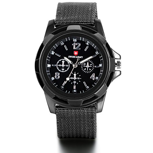JewelryWe Accessoires Montre Bracelet Montre Homme Toile Sportif Soldat Armée Militaire Décoration Trois Yeux Six Pointeurs Montre Quartz Alliage Fantaisie Longueur 24.5cm Couleur Noir Avec Sac Cadeau Cette puissance éventuellement s’agir de rechange montres votre choix