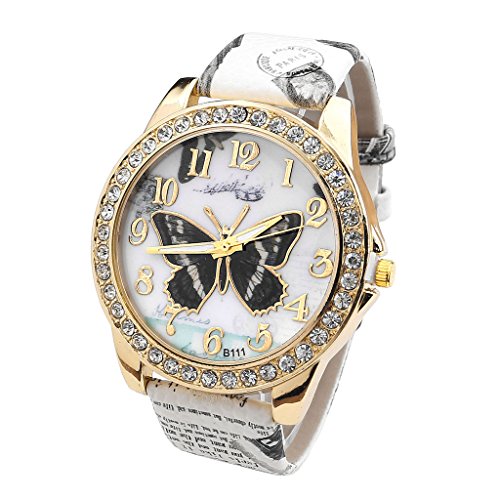 JSDDE Elegant Retro Femme Montre Quartz Analogique Faux Cristal Strass Cadran Dore de Papillon Bracelet Cuir PU Blanc Cela peut éventuellement s’agir de rechange montres votre choix