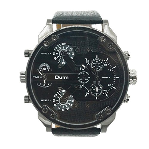 Image: OULM Montre Quartz Bracelet en Cuir Noir 2 Fuseaux Horaires Sports Armée Homme.