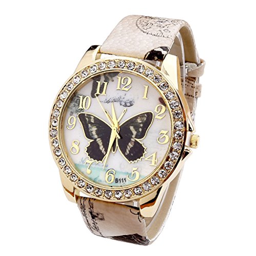 JSDDE Elégant Rétro Femme Montre Quartz Analogique Faux Cristal Strass Cadran Doré de Papillon Bracelet Cuir PU Beige Cela peut éventuellement s’agir de rechange montres votre choix