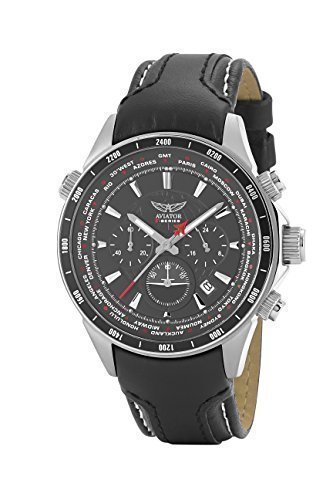 Montre Aviator Homme Bracelet Cuir Noir Heure Mondiale Chronographe Acier Inoxydable 100M WR AVW9169G181 Cette puissance éventuellement s’agir de rechange montres votre choix